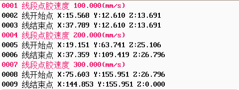 則0002-0003組成的線段以100毫米每秒的速度點膠,0005-0006組成的線段以200毫米每秒的速度點膠,0008-0009組成的線段以300毫米每秒的速度點膠。