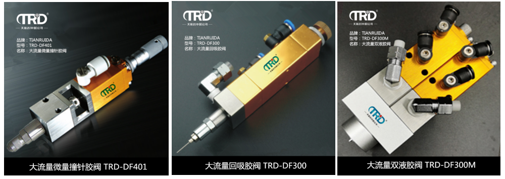 TRD-DF5大流量回吸膠閥是由點膠閥本身結構形成,不是真空回吸來影響的;回吸的來源是由于點膠閥中心桿鎖膠的瞬間是往上提升的,把點膠針頭的膠水,一下就回吸回去了。適用于中稠度或者高稠度的膠水;比如硅膠、黃膠等比較粘稠的流體或膏體,附帶回吸功能。 附帶活塞行程調整結構和防止液漏的回吸結構。大口徑設計,大流量回吸膠閥。輔助進氣口空氣輔助閉合